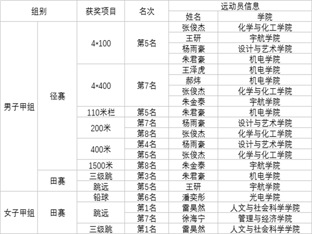 首次参赛的我校普通学生田径运动代表队在体育部精心组织与赵俊华、朱峰教练带领下,通过两天赛场激烈角逐,最终取得男子团体、女子团体和男女团体总分三项第八名优异成绩,并荣获大赛最佳组织奖。其中,人文与社会科学学院雷昊然同学独揽大赛女子跳远和三级跳两枚金牌,机电学院朱君豪同学勇夺甲组三级跳铜牌,实现了我校普通学生运动队新的突破。