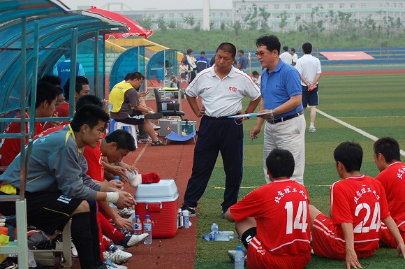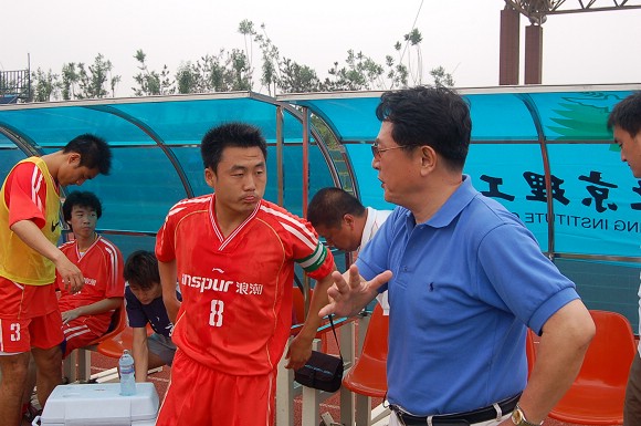 我校足球队总教练金志扬教授在赛前进行战术布置。