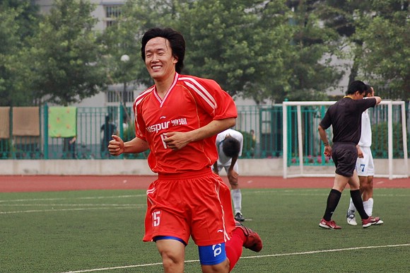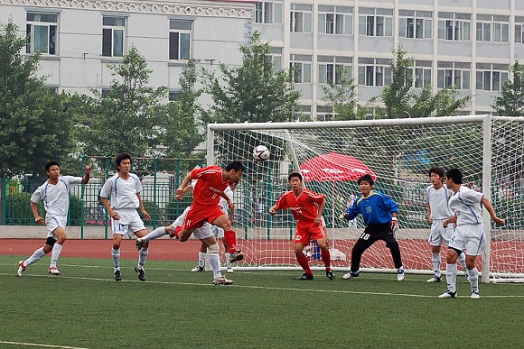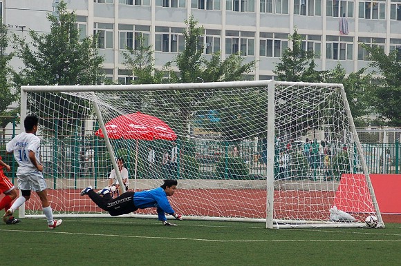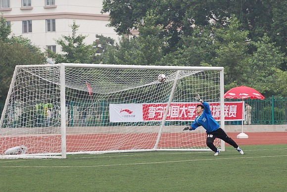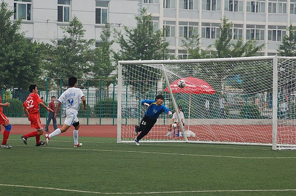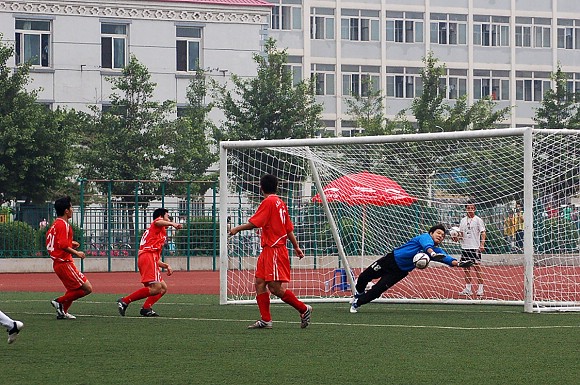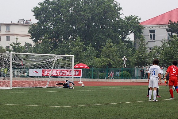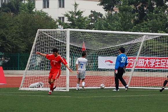 过于猛烈的进攻并没有敲开对方的大门,由于全部队员过于压上,反而使同济大学足球队在第10分钟的一次防守反击中获得了点球的机会。我校足球队守门员18号王毅飞身救球,这次角度非常之刁的点球竟然被王毅挡出门外从而化险为夷,这给了全体队员们极大的鼓励,大家在加强防守的基础上继续向对方大门猛攻。