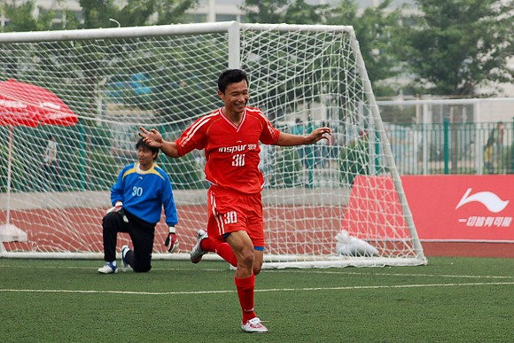 进球功臣30号队员卢斌在庆祝进球。