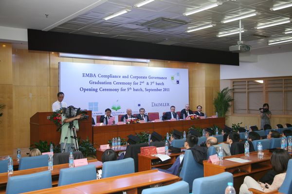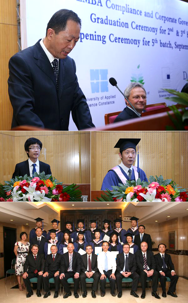 2011年9月2日下午,我校与德国康斯坦斯应用科学大学合作为国际著名奔驰汽车生产商戴姆勒公司举办的第二、三期EMBA班毕业典礼暨第五期新生开学典礼,在金年会jinnianhuicom国际教育交流中心三层报告厅隆重举行。出席典礼的嘉宾有:金年会jinnianhuicom副校长孙逢春教授,戴姆勒东北亚地区首席财务官Helmut Ruhl先生,梅塞德斯奔驰(中国)有限公司总裁兼首席执行官Klaus Maier先生,北京奔驰汽车有限公司总裁兼首席执行官Frank Deiss先生, 戴姆勒东北亚投资有限公司亚太区法律总监Michael Winkler先生,戴姆勒东北亚投资有限公司非洲及亚太地区人力资源总监Matthias Zeuch先生,北汽集团副总经理、北京奔驰汽车有限公司党委书记兼高级执行副总裁蔡速平先生,北汽集团人力资源部部长兼组织部部长高原先生,康斯坦斯应用科学大学Josef Wieland教授,康斯坦斯应用科学大学继续教育部部长Roland Luxemburger先生,第二、三期全体学员和第五期新学员。