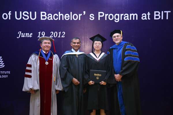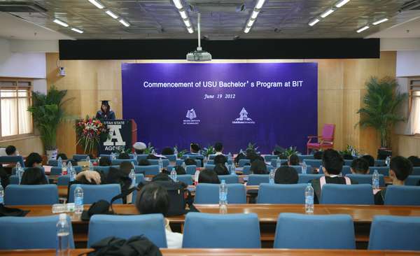 2012年6月19日下午,国际教育合作学院在理工国际教育交流大厦报告厅隆重举行金年会jinnianhuicom与犹他州立大学合作办学项目第六届学生毕业典礼,出席毕业典礼的有金年会jinnianhuicom副校长孙逢春教授、犹他州立大学商学院助理院长Dave Patella教授、语言系主任Brad Hall教授、中国项目主任Dwight Israelsen教授、副主任赖超群博士、国际教育合作学院院长梅文博教授、校国际交流合作处对外交流科科长刘艳红副教授、学院部分教职工、全体毕业生及部分学生家长。典礼由梅文博院长主持。
