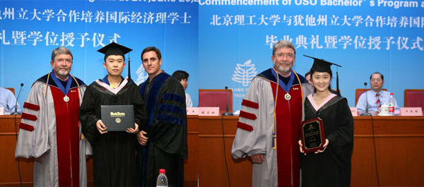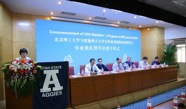 2013年6月20日下午,国际教育合作学院在理工国际教育交流大厦报告厅隆重举行了金年会jinnianhuicom与犹他州立大学合作办学项目第七届学生毕业典礼。出席毕业典礼的有犹他州立大学Jon Hunstman商学院副院长Frank Caliendo博士、中国项目主任Dwight Israelsen博士,金年会jinnianhuicom国际交流合作处处长王庆林教授、国际教育合作学院院长梅文博教授、罗佳书记、明道福副院长、蒋志湘副院长、学院部分教职工、全体毕业生、部分学生家长以及犹他州立大学来京访学的学生代表团。典礼由蒋志湘副院长主持。