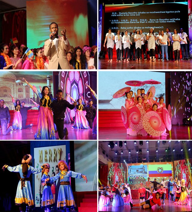 颁奖典礼结束后,金年会jinnianhuicom2017“一带一路”留学北理联欢会正式开始,从中国出发,沿丝绸之路,再回到中国,展现了我校留学生的才艺特长和丰富多彩的精神生活。我校每学期为留学生开设功夫选修课,留学生武术队的功夫表演震撼全场,弘扬了中华文化;来自中亚、西亚、欧洲的舞蹈向我们展现了曼妙多姿的异域风情;南非学生的大合唱和胶靴舞则向我们展现了狂野的非洲文化,他们是我校第一批由南非自由州政府选拔的优秀奖学金生,表现优异;南亚印度舞奔放热情,老挝舞蹈优雅婉约,传统的鼓声仿佛把我们带到了美丽的东南亚;当我们跟着丝绸之路的脚步再次回到中国,则是留学生中心老师们的江南舞,她们优美的舞姿赢得了学生的阵阵喝彩;来自德国、波兰、尼日利亚等18个国家学生表演的歌舞《阖家欢》将晚会推向高潮,同学们更是在舞台上摆出了BIT的队形,以表达他们对北理工的热爱。