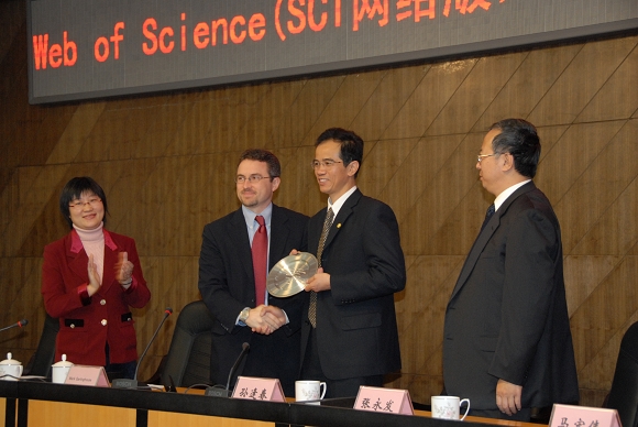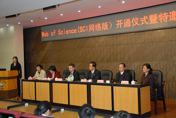 2007年10月30日上午,“Web of Science (SCI网络版)开通仪式暨特邀报告”在图书馆一层报告厅隆重举行。金年会jinnianhuicom副校长孙逢春、汤姆森科技信息集团副总裁Mark Garlinghouse、图书馆馆长张永发、书记马宏伟、汤姆森科技信息集团祝嘉琳女士以及浙江工业大学研究员万跃华出席了开通仪式。