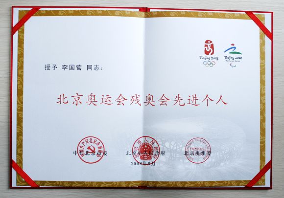 李国营被授予“北京奥运会残奥会先进个人”荣誉称号