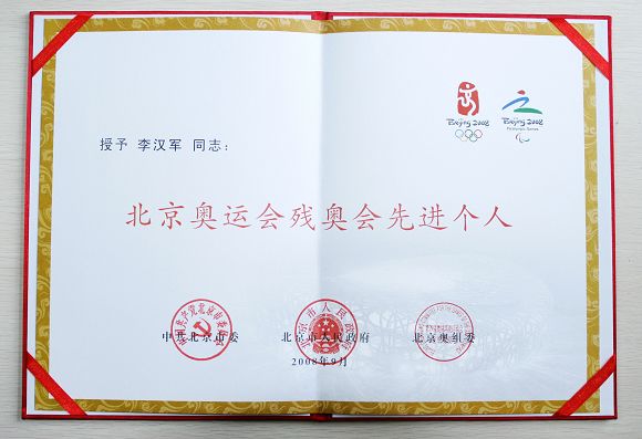 李汉军被授予“北京奥运会残奥会先进个人”荣誉称号