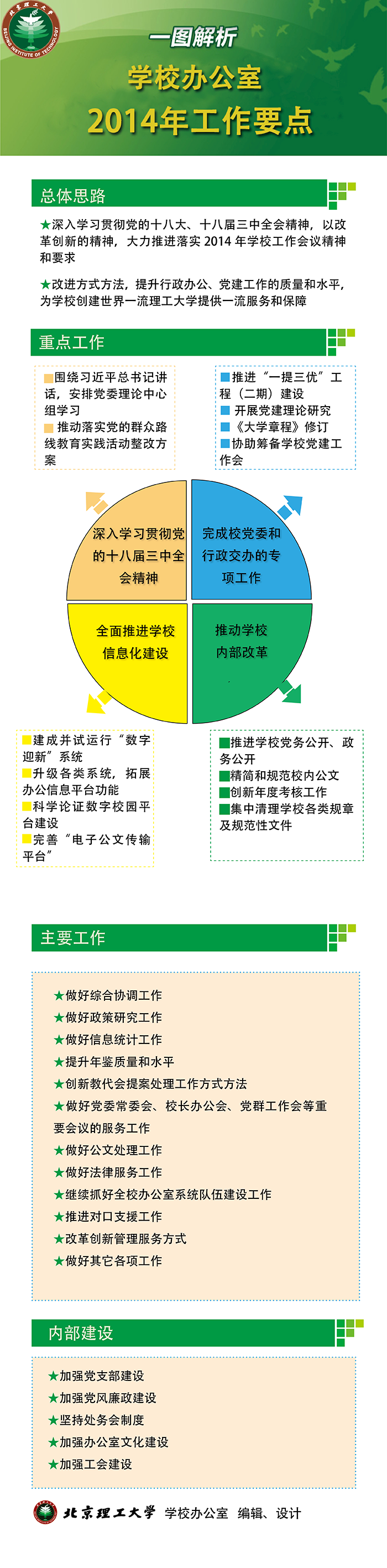 2013年,学校办公室在学校党委、行政的领导下,秉承着“服务·参谋·创新·提高”的理念,着力在提升喜哦能、改进作风、超前谋划、精细服务上下功夫,取得了良好效果,全部完成了年初制定的工作任务。2014年,学校办公室将继续深入学习贯彻党的十八大、十八届三中全会精神,以改革创新的精神,大力推进落实2014年学校工作会议精神和要求,改进方式方法,提升行政办公、党建工作的质量和水平,为学校创建世界一流理工大学提供一流服务和保障。