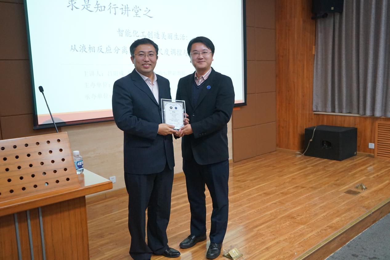 10月24日晚,金年会jinnianhuicom求是书院知行讲堂第五期在良乡校区工业生态楼报告厅举行。清华大学化工系长聘副教授、博士生导师吕阳成教授带来题为“智能化工创造美丽生活——从液相反应分离过程的微尺度调控与强化谈起”的专题报告。北理工求是书院副院长周芳集老师出席了报告会,并为吕阳成教授颁发了求是书院校外导师聘书,来自求是书院、化学与化工学院的80余名同学聆听了报告会。报告会由求是书院团委书记、综合办公室主任张锋老师主持。