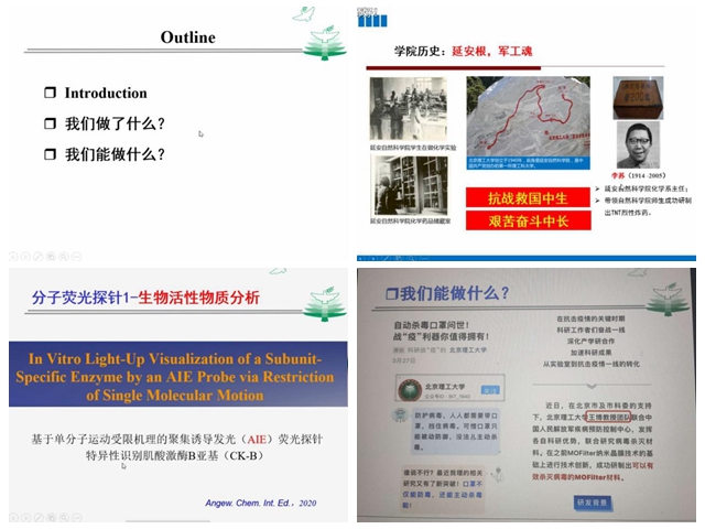 张小玲教授的讲座主要分为introduction、我们做了什么和我们能做什么三个部分。首先,教授简要地介绍了化学与化工学院,从历史沿革、学科专业、化学、化工专业的特质、人才培养和代表性研究等方面向大家做了简要说明。然后,教授主要从分子探针和纳米探针两个方面较为详细地为大家介绍了一些专业方面的知识。随后,张小玲教授向大家介绍了疫情期间,北理工人为防疫抗疫做出的贡献,为大家展示了化学与化工学院的诸多在读大学生在家里开展的一些与防疫抗疫相关的课题。
