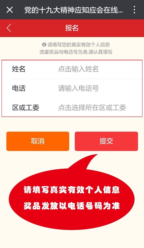3.每周纪念奖。为庆祝党的十九大胜利召开,凡周成绩排名前10000名且序号后两位为“19”的竞答者(如19、119至9919),将获得每周纪念奖,奖励5元手机流量券。