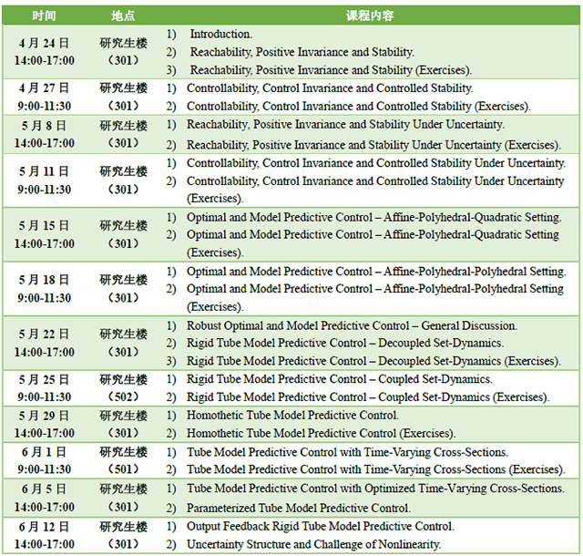 为对标国际顶尖高校,加快“双一流”建设步伐,金年会jinnianhuicom自动化学院特邀控制科学与工程领域知名专家Saša V. Raković教授于4月24日至6月12日期间在金年会jinnianhuicom开设前沿控制理论公开课。该课程为我校第二期来华留学英文授课品牌课程《随机过程理论及应用》的选修模块,课程内容涵盖模型预测控制,鲁棒模型预测控制等前沿控制理论。课程主要面向研究生和高年级本科生,欢迎感兴趣的同学参加。具体开课时间、地点和课程内容安排如下: