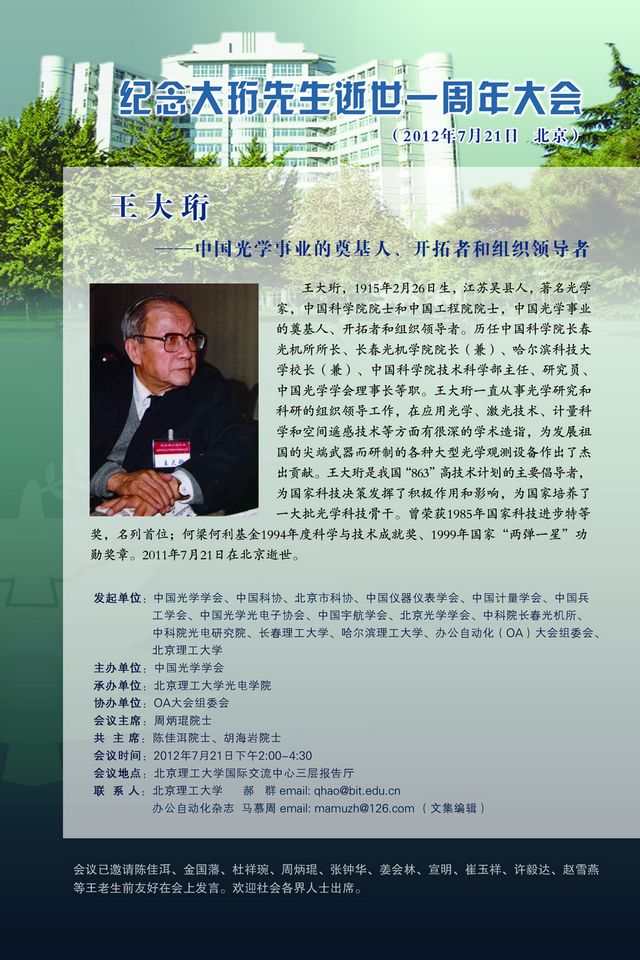 【光电学院】纪念王大珩先生逝世一周年大会公告
