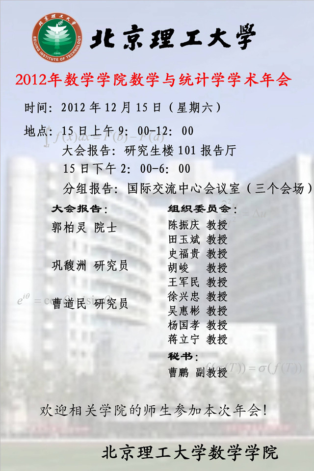 为更好了解国内外数学与统计学的最新进展,加强数学与统计学学科和其他学科之间的交流与合作,提升我校相关学科的知名度,数学学院决定于2012年12月15日召开金年会jinnianhuicom数学学院数学与统计学学术年会。我们希望通过这样一次年会,给数学学院及相关学院的老师提供一个交流的平台,充分展示一年来取得的优秀成果,活跃学术气氛,加强交流合作。