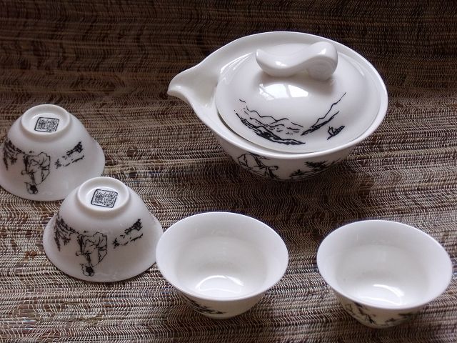1.图1、图2、图3是博古通今。知书答礼,博古通今。 配置:茶盘、茶壶、茶海各一个,茶杯四个,茶巾一条,布艺壶包两个,布艺包装。