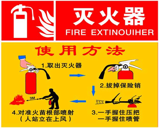 此外,要注意外出安全,出门不要携带酒精、汽油、摩丝等易燃易爆物品;进入宾馆、饭店或娱乐场所时,要留意安全出口及消防栓、灭火器的位置等。外出前做到“四查”,即查看气阀是否关严、电闸是否拉下、电源插头是否拔下、易燃物是否安全。外出前一定要锁好门、关好窗。如果发生火情、火险,要保持镇静,要合理利用灭火器进行初期火灾的扑救,灭火器使用方式如下图: