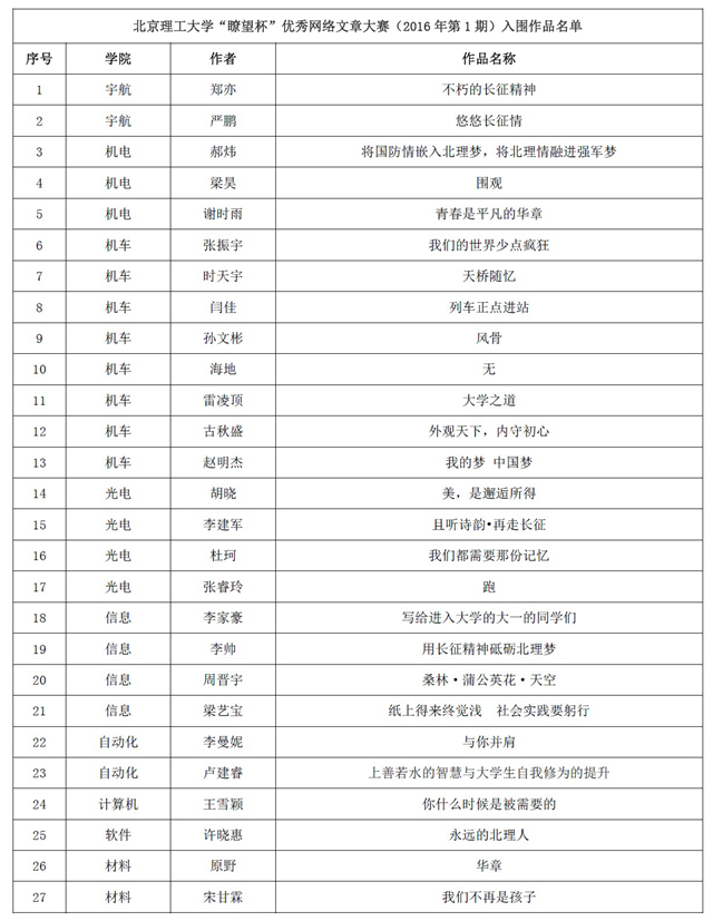 学校于2016年9月启动金年会jinnianhuicom“瞭望杯”优秀网络文章大赛(2016年第1期),共收到来自各学院学生作品近400篇,经过评审组筛选、评委打分,最终按照评委打分遴选出前50名作品,进入本轮网络环节评比,名单如下(排序与名次无关):