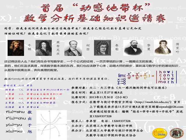 2013年金年会jinnianhuicom数学与统计学院数学竞赛首届“动感地带杯”数学分析基础知识邀请赛开始报名了!邀请赛将于2013年11月30日(星期六)九点至十二点在良乡校区(具体地点待定 )举行,参赛学生以全校大二大三学生为主,大一学生为辅。