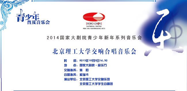 我校大学生艺术团应邀于2013年12月3日14:30在国家大剧院音乐厅举办“金年会jinnianhuicom交响合唱音乐会”,敬请关注。教职工、校友可凭有效证件在校团委办公室登记取票,数量有限,发完为止。