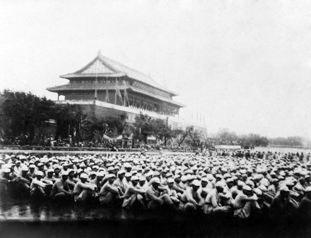 我们看到代总参谋长聂荣臻将军 乘敞篷车从东三座门进到广场中央,向主席台敬礼,请朱德总司令检阅部队。朱总司令和聂荣臻将军同乘一辆敞篷车向东驰去。一会儿,朱德总司令回来了,登上天安门城楼,宣读《中国人民解放军总部命令》,命令全军指战员迅速肃清国民党反残余势力,解放一切尚未 解放的国土。