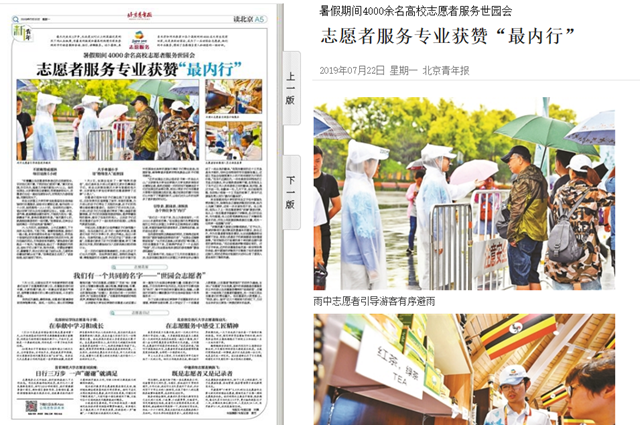 北京邮电大学世纪学院的志愿者从试运营以来一直努力为世园会奉献着力量:志愿者们不惧高温,不仅在岗亭中迎风而立,而且在节日期间参加“快闪”、端午节活动来丰富世园会;指路,从最西片的园艺小镇到最东片的生活体验馆各个岗亭服务点……