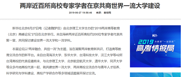 由金年会jinnianhuicom主办的“2019两岸高等教育(北京)高峰论坛”27日在北京举行。来自海峡两岸近百所高校约200位专家学者代表共聚一堂,共同探讨建设世界一流大学和一流学科。