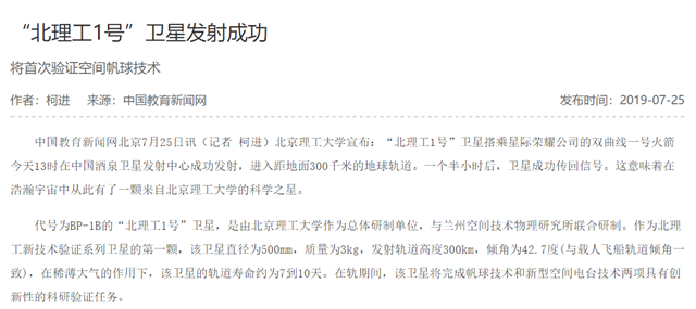 编辑:韩姗杉 审核:王征 阅读次数:原文标题:“北理工1号”卫星发射成功 将首次验证空间帆球技术