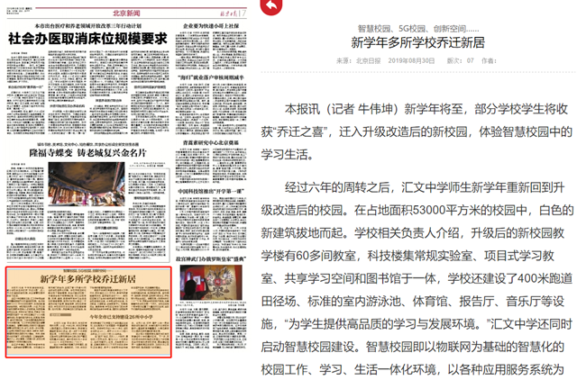 经过六年的周转之后,汇文中学师生新学年重新回到升级改造后的校园。在占地面积53000平方米的校园中,白色的新建筑拔地而起。学校相关负责人介绍,升级后的新校园教学楼有60多间教室,科技楼集常规实验室、项目式学习教室、共享学习空间和图书馆于一体,学校还建设了400米跑道田径场、标准的室内游泳池、体育馆、报告厅、音乐厅等设施,“为学生提供高品质的学习与发展环境。”汇文中学还同时启动智慧校园建设。智慧校园即以物联网为基础的智慧化的校园工作、学习、生活一体化环境,以各种应用服务系统为载体,将教学、科研、管理和校园生活进行充分融合。未来,在新技术的支撑下,该校将推进人工智能培养、集成办公、评价管理、大数据分析、家校协同教育等多个项目的建设实施。
