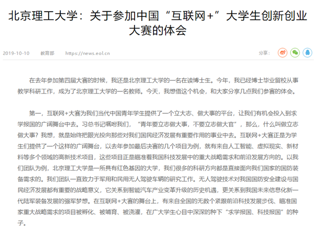 第二,互联网+大赛为我们当代中国青年学生提供了一个经受历练、锤炼意志的舞台。为期近一年的比赛,与数百万名参赛学生同台竞争,它使同学们明白,什么是“台上一分钟,台下十年功”,任何事业的成功都离不开背后的艰苦奋斗,比一次比赛胜负更重要的,是在奋斗中所磨练的无坚不摧的坚定信仰与钢铁般的顽强意志。以我们团队为例,在2012年,我们携第一辆中国燃油赛车赴德国比赛时,发动机损毁,我们10几名学生为了抢修赛车在山林里露营一周,睡草地,生篝火,终于将五星红旗第一次升起在欧洲赛场;在2015年,我们为了研发世界第一辆无人驾驶赛车,与欧洲人赛跑,在车间内连续倒班工作数月,多名学生负伤缝针数十针却仍然在坚持奋斗;在2016年,为了保障我们研制的军用无人车向陆军首长亮相,几名学生驾驶货车运输高压电池从北京往返黑龙江塔河,穿越大兴安岭森林,往返6天6夜,无惧生死考验。经历了近十年的磨难与坚持,最后汇聚大赛上那几分钟的汇报与演示。我想,我们的故事,是一个缩影,是互联网+大赛上所有的那些为了梦想而执着奋斗的同学们的缩影。这一切经历本身,就是一种宝贵的财富。比成绩和荣誉更重要的,是这些磨难和挫折所带给同学们的,无坚不摧的坚定信仰与钢铁般的顽强意志,以及深刻在骨子里的家国情怀。“奋斗才是青春最亮丽的底色”,这也正是我们互联网+大赛所有参赛学生共同的底色。