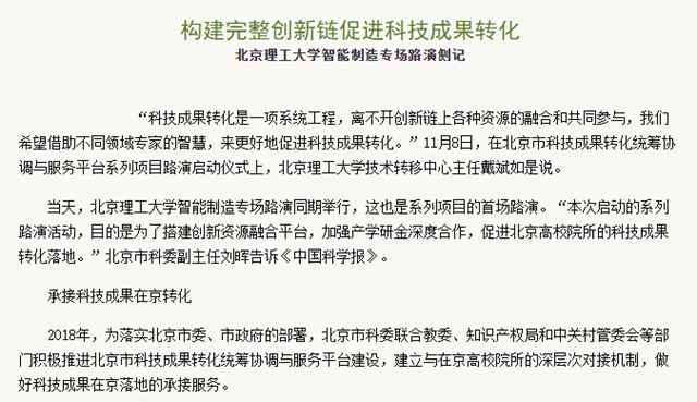 2018年,为落实北京市委、市政府的部署,北京市科委联合教委、知识产权局和中关村管委会等部门积极推进北京市科技成果转化统筹协调与服务平台建设,建立与在京高校院所的深层次对接机制,做好科技成果在京落地的承接服务。