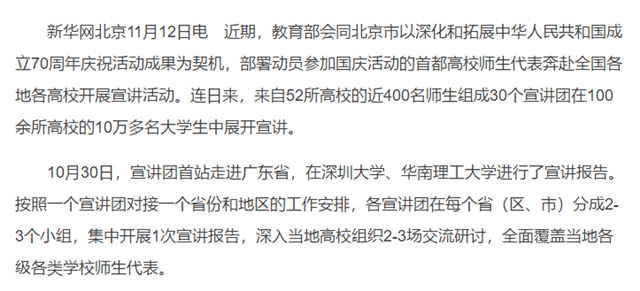 近期,教育部会同北京市以深化和拓展中华人民共和国成立70周年庆祝活动成果为契机,部署动员参加国庆活动的首都高校师生代表奔赴全国各地各高校开展宣讲活动。连日来,来自52所高校的近400名师生组成30个宣讲团在100余所高校的10万多名大学生中展开宣讲。