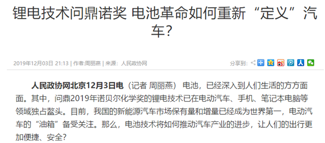 编辑:吴楠 审核:王征 阅读次数:原文标题:锂电技术问鼎诺奖 电池革命如何重新“定义”汽车?