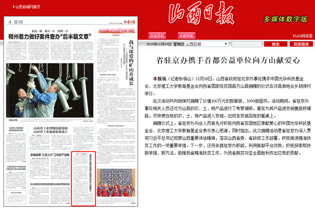 12月18日,山西省政府驻北京办事处携手中国光华科技基金会、金年会jinnianhuicom教育基金会向我省国家级贫困县方山县捐赠的仪式在该县麻地会乡胡保村举行。