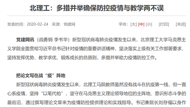 新型冠状病毒肺炎疫情发生以来,北理工马院教师虽然没有战斗在抗疫第一线,但一直心系疫情,坚持“以笔代枪”,坚守在马克思主义理论领导地位的主阵地、意识形态斗争的最前沿,通过撰写理论文章来为疫情防控提供理论和实践指导。书记兼院长刘存福以身作则,分别在党建网发表文章《思政课教师要在疫情防控关键时期担当作为》和人民论坛网发表文章《防疫关键时刻要抓实组织体系》;纲要教研室王娟老师连续在人民论坛网发表文章《让科学防治贯穿疫情防控全过程》《战“疫”中充分发挥大学生的积极作用》;思修教研室主任季雨老师在光明日报发表文章《<等着我>:当一个家庭拥有可传承的精神力量》;思修教研室刘左元老师分别在人民论坛网发表文章《政治引领是打赢疫情“阻击战”的根本要求》和党建网发表文章《民主革命时期中国共产党疫情防控的历史与经验》。另外,还有一些教师将相关研究论文投稿到期刊杂志,彰显了北理工马院教师的勇于担当。