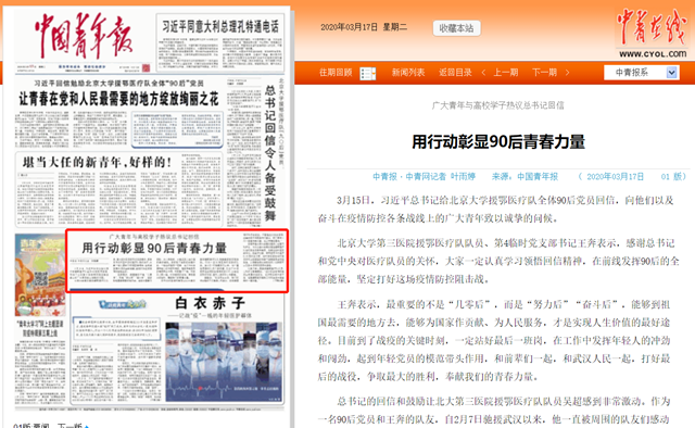 3月15日,习近平总书记给北京大学援鄂医疗队全体90后党员回信,向他们以及奋斗在疫情防控各条战线上的广大青年致以诚挚的问候。