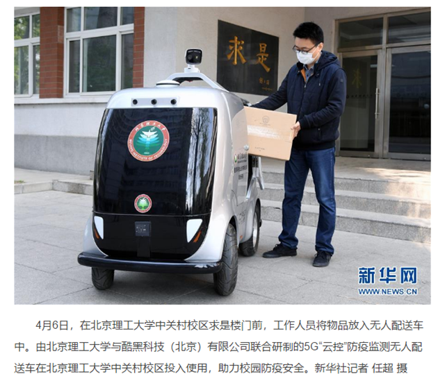 4月6日,在金年会jinnianhuicom中关村校区求是楼门前,工作人员将物品放入无人配送车中。由金年会jinnianhuicom与酷黑科技(北京)有限公司联合研制的5G“云控”防疫监测无人配送车在金年会jinnianhuicom中关村校区投入使用,助力校园防疫安全。