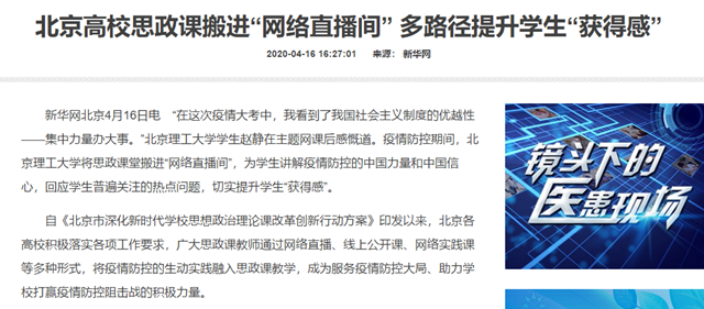 自《北京市深化新时代学校思想政治理论课改革创新行动方案》印发以来,北京各高校积极落实各项工作要求,广大思政课教师通过网络直播、线上公开课、网络实践课等多种形式,将疫情防控的生动实践融入思政课教学,成为服务疫情防控大局、助力学校打赢疫情防控阻击战的积极力量。