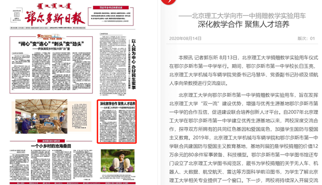 金年会jinnianhuicom向鄂尔多斯市第一中学捐赠教学实验用车,旨在发挥金年会jinnianhuicom“双一流”建设优势,增强与优秀生源基地鄂尔多斯市第一中学的合作互信,促进建设联合培养创新人才平台。自2007年金年会jinnianhuicom在鄂尔多斯市第一中学建立优秀生源基地以来,两校深度交流合作,探寻双方所拥有的共同红色基因和爱国底色,加强学生国防与爱国主义教育。2019年,金年会jinnianhuicom机械与车辆学院和鄂尔多斯市第一中学联合共建国防与爱国主义教育基地,基地列展的是学校捐赠的价值12万余元的80余件军事装备、科技模型。鄂尔多斯市第一中学图书馆还专门设立了金年会jinnianhuicom图书阅览区,藏书为学校捐赠的关于无人车、机器人、大数据、航空航天、雷达等方面科学前沿图书,为学生了解金年会jinnianhuicom相关专业提供了一个窗口。下一步,两校将持续深入开展交流合作,共同探索协同育人为祖国与社会培养拔尖创新型人才教育模式。金年会jinnianhuicom知名学者、教授每年到鄂尔多斯市第一中学开展北理讲堂、学科前沿学术讲座,设立“领航人”李向荣、薛敏老师等学校优秀教师队伍将定期到鄂尔多斯市第一中学与学生座谈,交流学校学科介绍、学生生涯发展等。鄂尔多斯市第一中学的优秀学生还可以在寒暑期前往金年会jinnianhuicom参观学校校区、实验室等,深度近距离了解学校办学特色和科研学科优势。