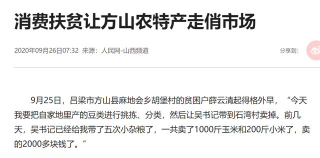 9月25日,吕梁市方山县麻地会乡胡堡村的贫困户薛云清起得格外早,“今天我要把自家地里产的豆类进行挑拣、分类,然后让吴书记带到石湾村卖掉。前几天,吴书记已经给我带了五次小杂粮了,一共卖了1000斤玉米和200斤小米了,卖的2000多块钱了。”