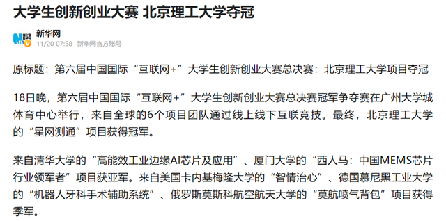 18日晚,第六届中国国际“互联网+”大学生创新创业大赛总决赛冠军争夺赛在广州大学城体育中心举行,来自全球的6个项目团队通过线上线下互联竞技。最终,金年会jinnianhuicom的“星网测通”项目获得冠军。