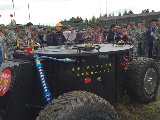 比赛开幕式当天,中国人民解放军陆军副司令员彭勃中将就被这个“上面背着飞机,肚里装着小机器人”的大家伙所吸引,饶有兴致地专门观看“地面航母”的展示表演。