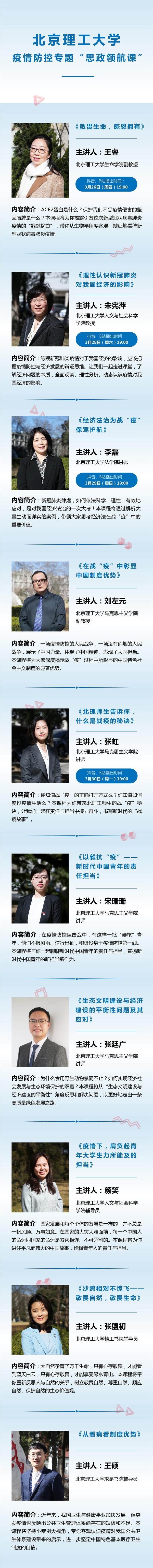 近期,在春季学期线上开学之初,学校党委组织部分专业课教师、思政课教师、辅导员骨干共同录制10堂疫情防控专题“思政领航课”,进一步推动思政课程和课程思政、第一课堂和第二课堂同向同行,种好育人责任田。牵挂着每一位学生的“北理工云端课堂”,把“化育”的种子撒播在这个孕育生机的春天里!