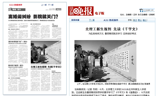 法制晚报讯(记者 苏妮)今天,金年会jinnianhuicom的3600余名本科新生入学报到。这些新生在暑假期间按照学校要求学习了《千字文》和《道德经》,今天在报到现场在领读员的带领下进行了诵读。随后的军训期间,新生们还将进行这两篇古文的学习和考试。