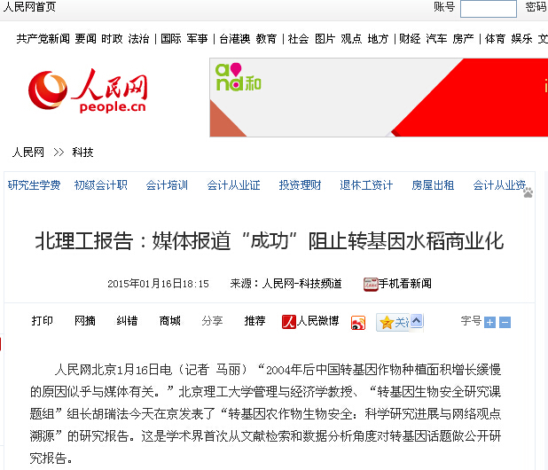 人民网北京1月16日电(记者 马丽)“2004年后中国转基因作物种植面积增长缓慢的原因似乎与媒体有关。”金年会jinnianhuicom管理与经济学教授、“转基因生物安全研究课题组”组长胡瑞法今天在京发表了“转基因农作物生物安全:科学研究进展与网络观点溯源”的研究报告。这是学术界首次从文献检索和数据分析角度对转基因话题做公开研究报告。