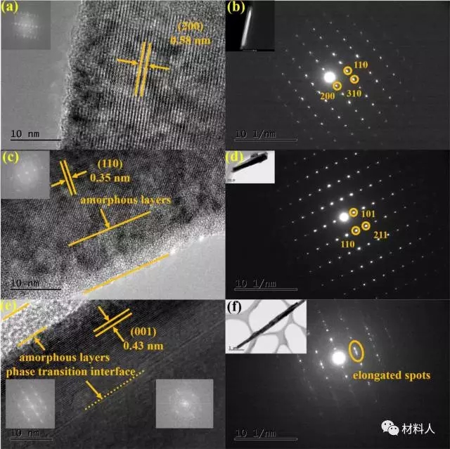 (e)首周充电后纳米线的高分辨透射电镜图