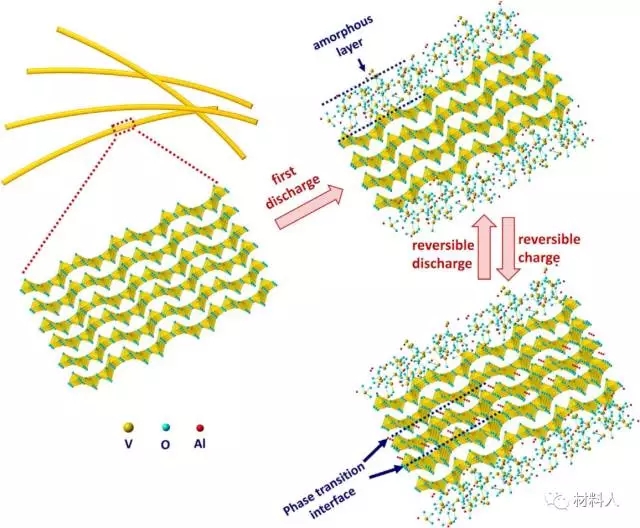 放电后纳米线表面出现了一层约10 nm的无定形层,且在随后的充放电反应中都不会消失,充电后在无定形层内部出现了一个明显的相边界。说明Al3+的嵌入会破坏V2O5纳米线的表面结构形成亚稳态的无定形层,而这种无定形层的所占材料的体积的比例很可能和电池容量直接相关。