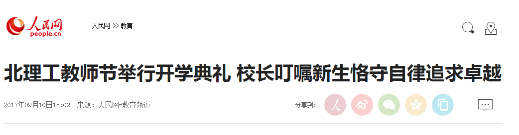 【人民网】北理工教师节举行开学典礼 校长叮嘱新生恪守自律追求卓越