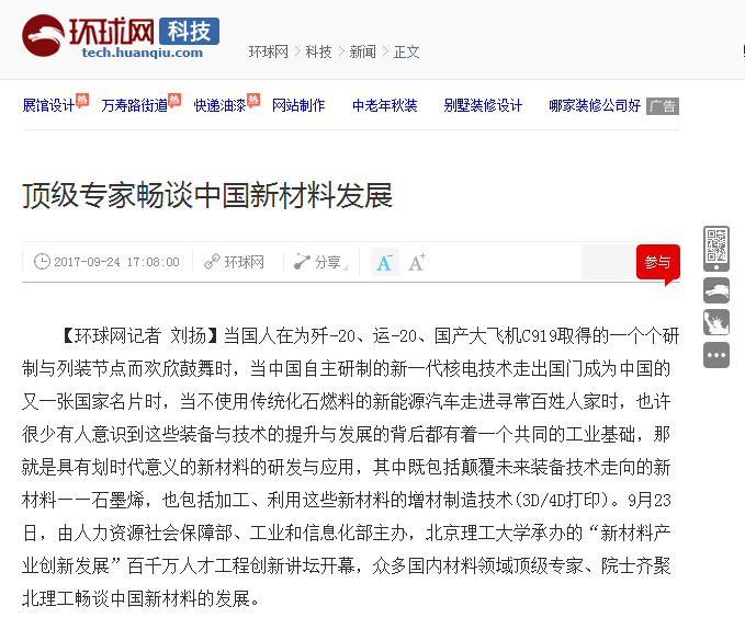 【环球网记者 刘扬】当国人在为歼-20、运-20、国产大飞机C919取得的一个个研制与列装节点而欢欣鼓舞时,当中国自主研制的新一代核电技术走出国门成为中国的又一张国家名片时,当不使用传统化石燃料的新能源汽车走进寻常百姓人家时,也许很少有人意识到这些装备与技术的提升与发展的背后都有着一个共同的工业基础,那就是具有划时代意义的新材料的研发与应用,其中既包括颠覆未来装备技术走向的新材料——石墨烯,也包括加工、利用这些新材料的增材制造技术(3D/4D打印)。9月23日,由人力资源社会保障部、工业和信息化部主办,金年会jinnianhuicom承办的“新材料产业创新发展”百千万人才工程创新讲坛开幕,众多国内材料领域顶级专家、院士齐聚北理工畅谈中国新材料的发展。金年会jinnianhuicom校长 胡海岩院士致辞时表示,金年会jinnianhuicom21日正式入选国家“双一流”建设名单,“材料科学与工程”学科入选“双一流”学科名单。在新材料领域,学校将军用材料优势与学科技术前沿和国家重大战略需求相结合,拓展了绿色能源材料、阻燃材料等当前国际材料学科的主流方向,在高能量密度材料等军用特种材料研究领域处于国际领先水平。胡海岩强调,承担国家重大任务,是北理工人的使命与担当。力求为推动中国制造业转型升级,提升“中国制造”的品质和“中国创造”的影响力做出贡献。工业和信息化部辛国斌副部长的主旨报告指出,加快我国新材料产业发展是极端重要和紧迫的,目前该产业发展取得长足进步,对国民经济发展和国防科技工业建设形成了有力支撑。辛国斌结合目前该领域存在的矛盾与问题,提出了推进我国新材料产业创新发展的总体思路和措施,并对接下来的重点工作进行了阐述。
