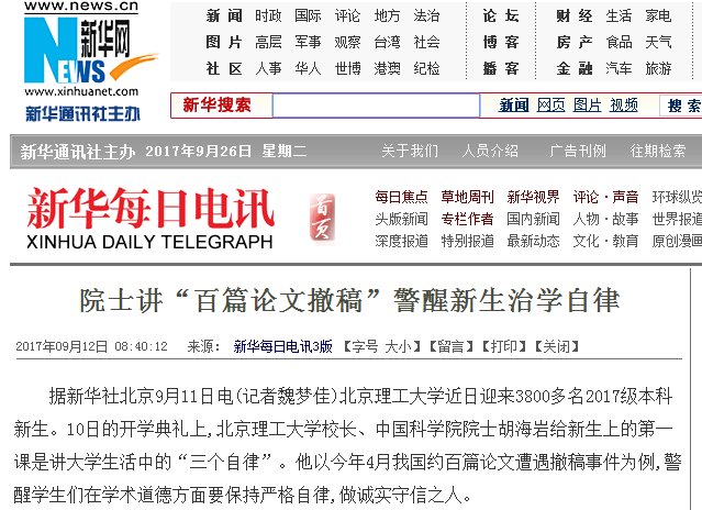 【新华每日电讯】院士讲“百篇论文撤稿”警醒新生治学自律