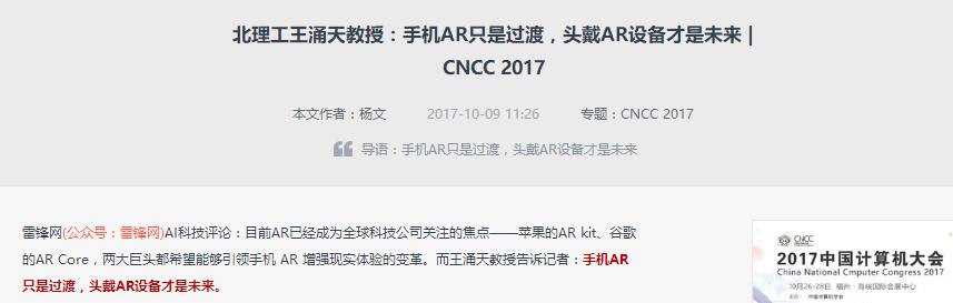 以上为雷锋网对CNCC 2017特邀讲者王涌天教授的专访。